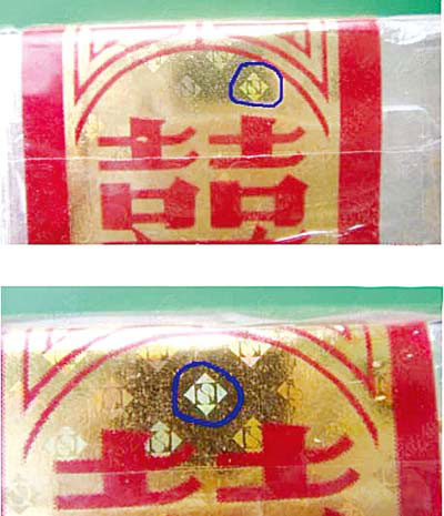 图二:真烟封签的镭射标志上有清晰的“N”字形;假烟封签的镭射标志上则为“口”字形。