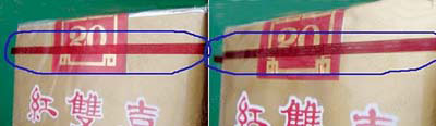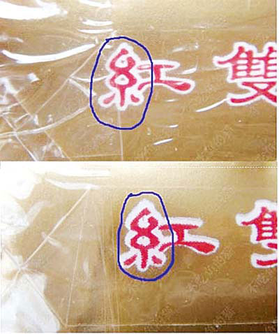 图三:真烟上“红”字的繁体偏旁有明显的印刷空隙;假烟一般没有,就算有,也是很小一点。