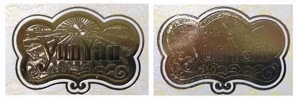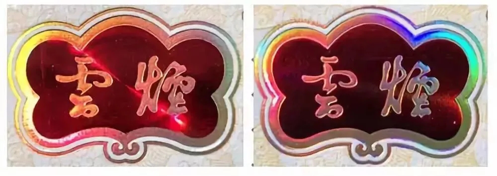 真品卷烟:云烟注册商标图案,红色底纹采用3D立体透视技术。转动商标图案,会有镭射光柱随角度变动而转动。